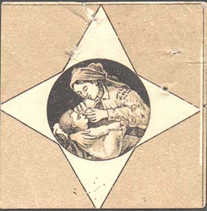 1924(?) г. Разм. 50 х 50 мм. Одноцветная печать на белой бумаге. В центре на сплошном фоне четырехконечная звезда, в центре которой в круглой рамке изображение женщины с ребенком на руках.
