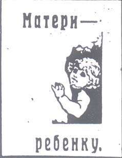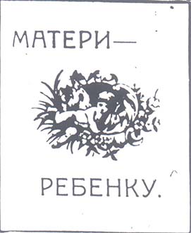 1925(?) г. Разм. 45 х 56 мм. Одноцветная печать на толстой белой полуглянцевой бумаге. В центре различные рисунки. Сверху текст: «Матери -». Внизу продолжение текста: «Ребенку».