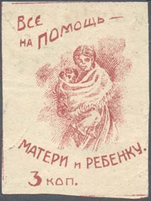 1930(?) г. 1930(?) г. Разм. 35 х 46 мм. Одноцветная печать на тонкой белой бумаге. В центре женщина с ребенком на руках. Сверху полукругом текст: «Все на помощь - ». Внизу полукругом продолжение текста: «Матери и ребенку». В левом нижнем углу номинал.