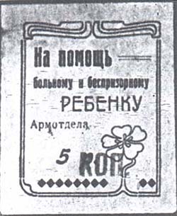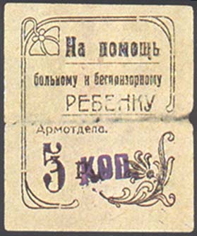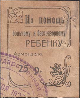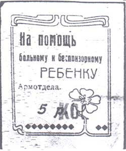 1923 г. Разм. 45 х 54 мм. Одноцветная печать на желтоватой бумаге. В декоративной рамке с растительным орнаментом разм. 31 х 45 мм сверху текст в четыре строки: «На помощь больному и беспризорному ребенку Армотдела». Внизу номинал и орнамент из ромбиков.