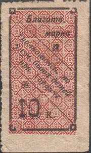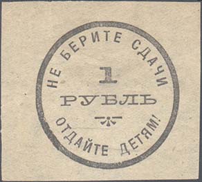 1923(?) г. Разм. 48 х 44 мм. Одноцветная печать на тонкой желтоватой бумаге. В центре в круглой рамке диаметром 35 мм номинал в две строки. Внизу декоративный элемент. По внутреннему периметру рамки тест: «Не берите сдачи. Отдайте детям!».