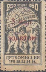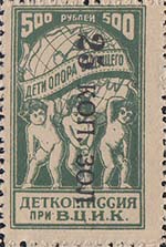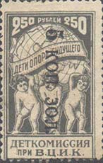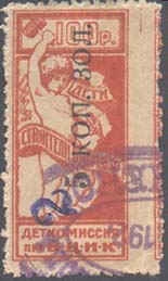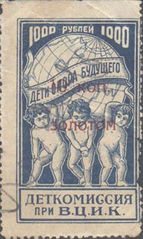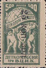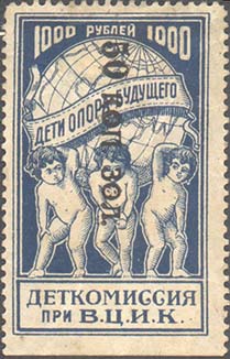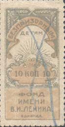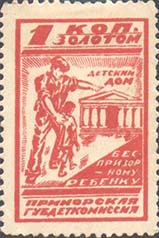 1924 г. Разм. рамки 22 х 33 мм. В прямоугольной рамке в центре рабочий показывает беспризорному ребенку на дом с надписью над фасадом: «Детский дом». Верху номинал в две строки. Внизу текст в две строки: «Приморская губдеткомиссия».