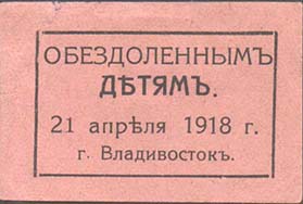 1918 г. 21.04.1918 г. Разм. 48 х 31 мм. Одноцветная печать на светло-розовой бумаге. В центре в прямоугольной рамке разм. 37 х 22 мм текст в четыре строки: «Обездоленным детям 21 апреля 1918 г. г. Владивосток».