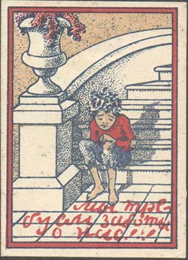 1923 г. 07.10.1923 г. Разм. 46 х 64 мм. Одноцветная печать на белой бумаге. В центре в толстой прямоугольной рамке сидящий на лестнице беспризорный ребенок. Внизу текст в три строки: «Мы требуем заботы о нас».