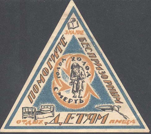 1923 г. 22.12.1923 г. Треугольник разм. 82 х 72 мм. Двухцветная печать на белой бумаге. В центре в треугольной рамке разм. 72 х 67 мм аллегорический рисунок: в центре беспризорный ребенок, окруженный тремя стрелками с надписями «Голод», «Холод», «Смерть». По периметру рамки рисунки: книга и глобус, кровать и тарелка с ложкой. Под рисунками подписи: «Знание», «Отдых», «Пища». По внутреннему периметру рамки текст: «Помогите беспризорным детям».