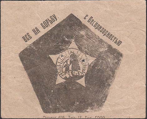 1929 г. 15-17.05.1929 г. Разм. 75 х 65 мм. мм. Одноцветная печать на серой бумаге. В центре рамка в форме пятиугольника разм. 55 х 53 мм. В центре пятиконечная звезда, в центре которой женщина с ребенком на фоне восходящего солнца. Сверху текст: «На борьбу с беспризорностью». Внизу мелким шрифтом выходные данные: «Окрлит 616 Тип.17. Тираж 5000».