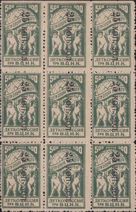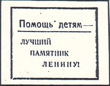 1922 г. Разм. 52 х 55 мм. Одноцветная печать на бумаге различных цветов и качества. В рамке из квадратиков с закругленными краями разм. 35 х 40 мм. В центре круг из квадратиков с орнаментом в центре. По периметру рамки текст: «Все на помощь! Голодным и беспризорным детям. Жертвуйте в помощь детям».