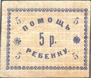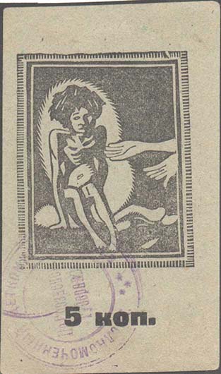 1923 г. Разм. 52 х 88 мм. Одноцветная печать на серо-зеленой бумаге. В центре в двойной декоратив-ной рамке 41 х 52 мм истощенный ребенок, к которому протягиваются руки. Внизу номинал: «5 коп.». На лицевой стороне фиолетовый оттиск круглой печати диаметром 35 мм. На печати текст: «Уполномоченный Деткомиссии по Грозненской губернии».