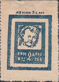 1925(?) г. Разм. 43 х 57 мм. Одноцветная печать на белой бумаге. В центре в прямоугольной рамке разм. 34 х 42,5 мм портрет Володи Ульянова трех лет. Сверху полукругом текст: «Помоготе беспризорным». Внизу текст: «21 апреля 1870». Ниже текст на армянском(?) языке.