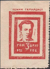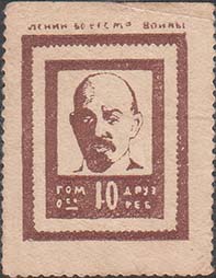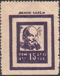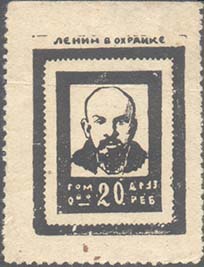 1924 г. Разм. рис. 26 х 32 мм. Одноцветная печать низкого качества на желтоватой бумаге. Зубц. 11 1/2. В центре на сплошном фоне стилизованное изображение марки с портретами В.И.Ленина в различные периоды жизни. Сверху пояснительный текст к портрету. Внизу номинал и текст в две строки: «Гом[ельское]. О-во Друз[ей]. Реб[енка].».
