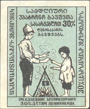 1924(?) г. Разм. 51 Х 62 ММ. Двухцветная печать на белой бумаге. В двойной прямоугольной рамке разм. 44 х 57 мм двое беспризорных детей у костра, на котором подвешен котелок. Внизу текст в две строки: «Трехдневник беспризорного. 30% детям Ленинакана». Сверху текст в пять строк на армянском языке. Слева и справа между рамками тексты на армянском языке.