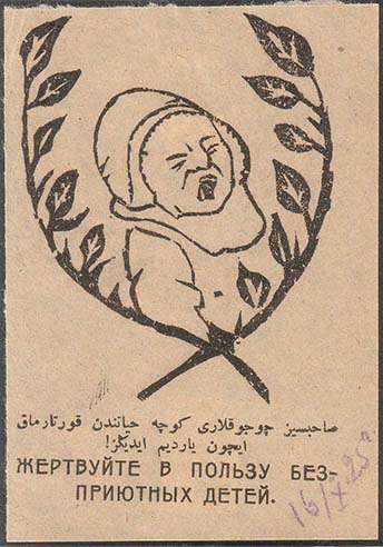 1925 г. 16.10.1925 г. Одноцветная печать на бумаге различных цветов. В центре различные рисунки. Внизу текст в две строки на русском и азербайджанском языке арабской графикой: «Жертвуйте в пользу бесприютных детей».