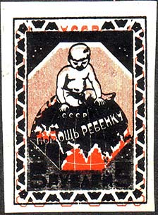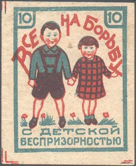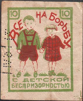 1931 г. Разм. рамки 45 х 55 мм. Двухцветная печать на сероватой бумаге. В центре в прямоугольной рамке разм. 38 х 48 мм двое детей держатся за руки. Сверху полукругом текст: «Все на борьбу». Внизу продолжение текста в две строки: «С детской беспризорностью». Сверху по углам рамки номинал.