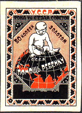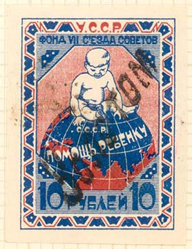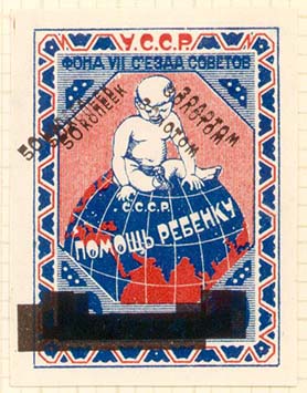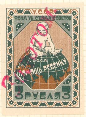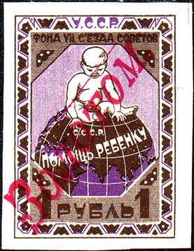 1923 г. Разм. рамки 32 х 44 мм. Двухцветная печать на белой (оттенки) бумаге. В центре в восьмиугольной рамке ребенок, сидящий на земном шаре. На земном шаре текст: «Помощь ребенку». Сверху текст: «У.С.С.Р.». Ниже под рамкой текст: «Фонд VII съезда советов». Внизу номинал.