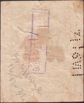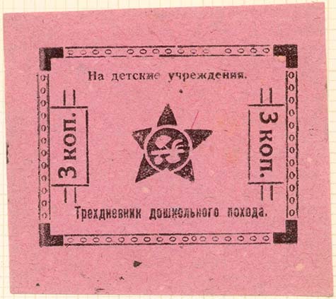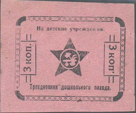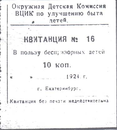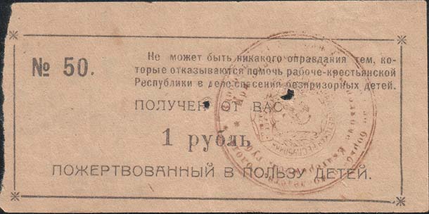 1924 г. Листок из квитанционной книжки разм. ≈ 102 х 50 мм. Одноцветная печать на тонкой светло-серой бумаге. В прямоугольной рамке разм. 93 х 38 мм с декоративными элементами по углам в центре текст в три строки: «Получено от вас ... рубль пожертвованный в пользу детей». В правом верхнем углу текст в три строки: «Не может быть никакого оправдания тем, которые отказываются помочь рабочее-крестьянской Республике в деле спасения беспризорных детей». В левом верхнем углу номер. На лицевой стороне темно-фиолетовый оттиск круглой контрольной печати диаметром 40 мм.
