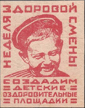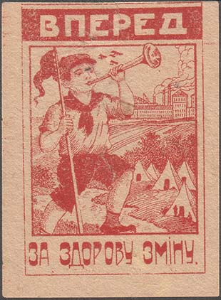 1930 г. 26.-27.04.1930 г. Разм. 51 х 72 мм. Одноцветная печать на тонкой кремовой бумаге. В центре в прямоугольной рамке разм. 39 х 45 мм пионер с флажком и горном на фоне пионерского лагеря и индустриального пейзажа. Сверху и снизу текст в две строки на украинском языке: «Вперед за здоровую смену».