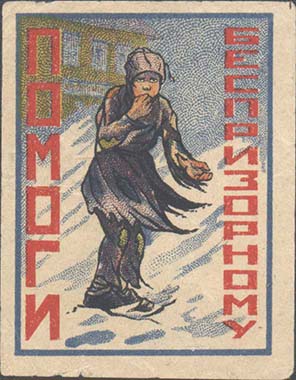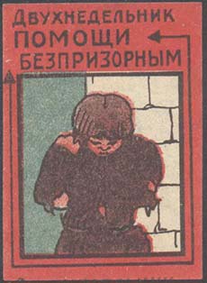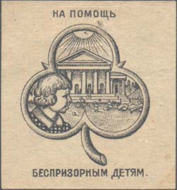 1924(?) г. Разм. 42 х 45 мм. Одноцветная печать на кремовой бумаге. В центре в фигурной рамке в форме трехлепесткового цветка девочка на фоне дома с колоннам на фоне лучей восходящего солнца. Сверху текст: «На помощь». Внизу продолжение текста: «Беспризорным детям».