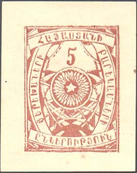 1925(?) г. Разм. 44 х 56 мм. Одноцветная печать на плотной кремовой бумаге. В центре в двойной прямоугольной рамке разм. 31 х 41 в декоративной рамке в центре в круге пятиконечная звезда. На лентах по периметру рамке текст на армянском языке: «Общество друзей беспризорных детей Армении». Сверху на картуше номинал. На обороте фиолетовый оттиск круглой печати общества.