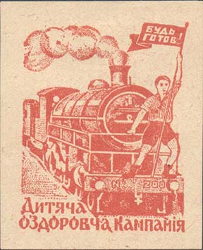1930 г. Разм. 48 х 60 мм. Одноцветная печать на желто-ватой бумаге. Паровоз, на котором стоит пионер с флажком. На флажке текст: «Будь готов!». Внизу текст в две строки на украинском языке: «Детская оздоровительная компания».