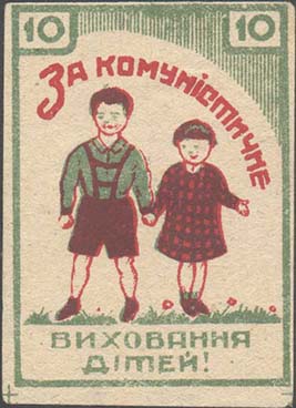 1931 г. Разм. рамки 42,5 х 58 мм. Двухцветная печать на тонкой сероватой бумаге. В центре двое де-тей держатся за руки. Сверху текст на украинском языке: «За коммунистическое». Внизу продолжение текста в две строки: «Воспитание детей!». Сверху в углах рамки номинал.