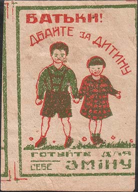 1931 г. Разм. рамки 42 х 57 мм. Двухцветная печать на тонкой сероватой бумаге. В центре двое детей держатся за руки. Сверху текст в две строки на украинском языке: «Отцы! Заботьтесь о детях». Внизу продолжение текста в две строки: «Готовьте для себя смену».