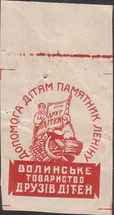 1928 г. Разм. 38 х 52 мм. Одноцветная печать на белой бумаге. В центре значок ОДД УССР. По окружности текст на украинском языке: «Помощь детям – памятник Ленину». Внизу на сплошном фоне текст в три строки: «Волынское Общество Друзей ДЕТЕЙ».