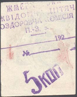 1930 г. Фиолетовая надпечатка номинала «5 коп.» и названия организации в семь строк: «НКТ Жмеринская межведомственная детская оздоровительная комиссия. Ю.-З.Ж.Д. ...192... №...». На знаках предыдущего выпуска.