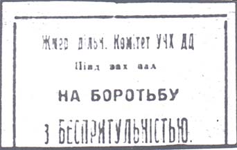 1932 г. Сентябрь Разм. 56 х 40 мм. Одноцветная печать на белой бумаге. На оборотной стороне фрагмент рисунок неизвестного происхождения. В центре в прямоугольной рамке разм. 43 х 31 мм текст в четыре строки на украинском языке: «На борьбу за ликвидацию детской беспризорности».
