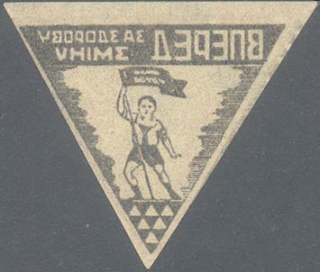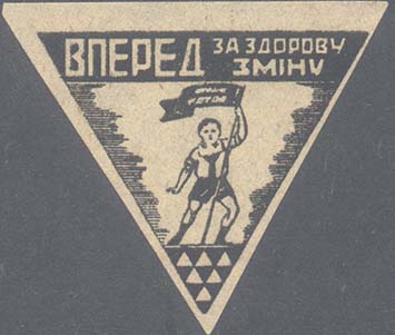1931 г. Виньетка в виде перевернутого треугольника разм. 60 х 50 мм. Одноцветная печать на бумаге различных цветов. В треугольной рамке разм. 50 х 43 мм в центре пионер с флагом, на полотнище которого текст на украинском языке в две строки: «Юный пионер». Внизу орнамент из треугольников. Сверху текст в две строки на украинском языке: «Вперед за здоровую смену».