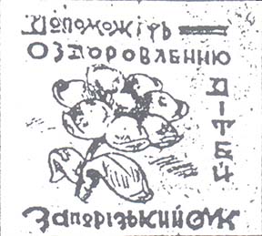 1930(?) г. Разм. 50 х 46 мм. Одноцветная печать на красновато-фиолетовой бумаге. В центре цветок. Сверху и справа текст на украинском языке: «Помогите оздоровлению детей». Внизу текст на украинском языке: «Запорожский ОМК».