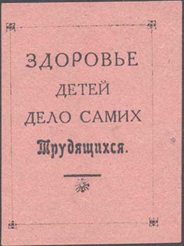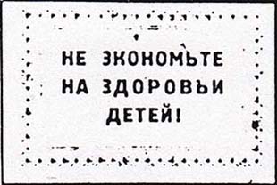 1927 г. Разм. 52 х 34 мм. Одноцветная печать на бумаге различных цветов. В тройной прямоугольной рамке разм. 45 х 30 мм текст в три строки: «Не экономьте на здоровье детей».