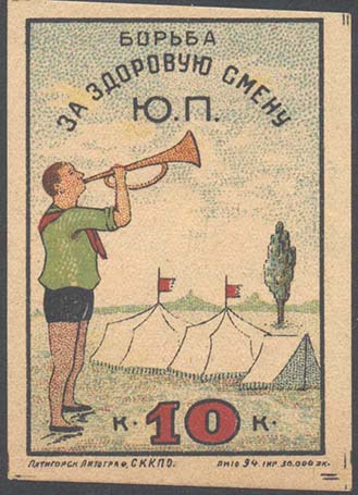 1924(?) г. Разм. 53 х 76 мм. Многоцветная печать на кремовой бумаге. В центре в прямоугольной рамке разм. 46 х 67 мм пионер с горном на фоне палаток. Сверху текст в три строки: «Борьба за здоровую смену Ю.П.». Внизу номинал. Внизу под рамкой выходные данные мелким шрифтом: «Пятигорск Литограф. СККПО. Лито 94 тир. 30.000 экз.».