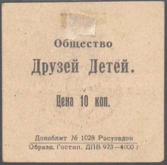 1925(?) г. Разм. 55 х 55 мм. Двухцветная двухсторонняя печать на желтоватой бумаге. На лицевой стороне крупными буквами аббревиатура «ОДД». На оборотной стороне в центре текст в три строки: «Общество Друзей Детей Цена 10 коп.». Внизу мелким шрифтом в две строки выходные данные: «Доноблит №1028 Ростовдон. Образц. Гостип. ДПБ 923-40000».