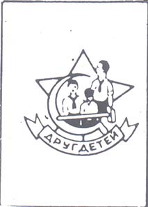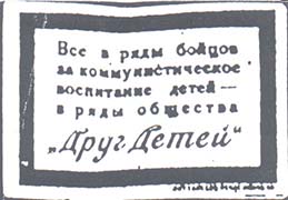 1930 г. Разм. 44 х 31 мм. Одноцветная печать на толстой желтоватой бумаге. В центре в прямоугольной рамке раз. 40 х 27 мм текст в пять строк: «Все в ряды бойцов за коммунистическое воспитание детей – в ряды общества «Друг Детей»». В правом нижнем угли мелким шрифтом неразборчиво выходные данные.