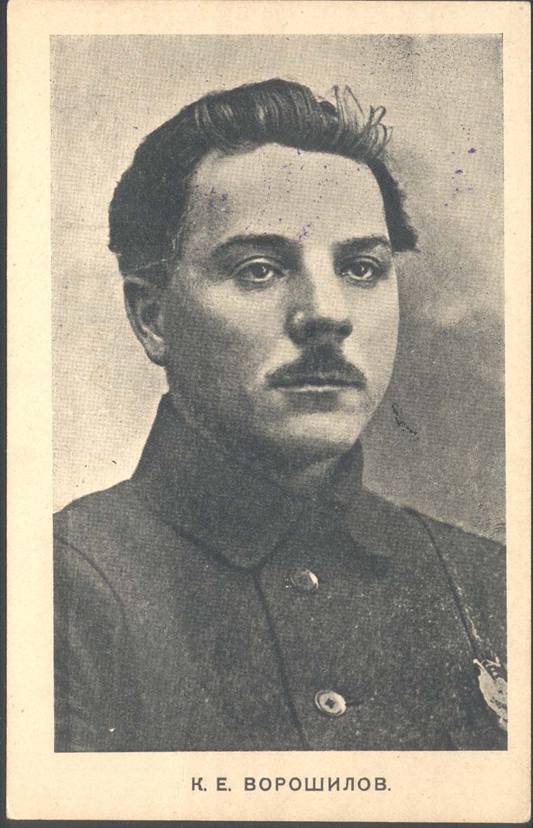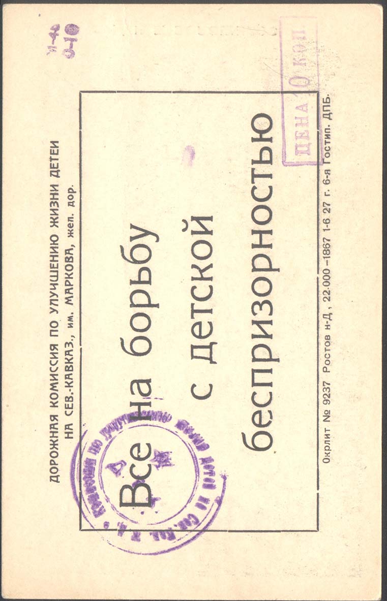 1927 г. 01.06.1927 г. Листок разм. 95 х 148 мм. Одноцветная двухсторонняя печать на толстой кремовой бумаге. На лицевой стороне в рамке разм. 82 х 129 мм портрет К.Е.Ворошилова. Внизу подпись к портрету: «К.Е.Ворошилов». На оборотной стороне в прямоугольной рамке разм. 110 х 59 мм текст в три строки: «Все на борьбу с детской беспризорностью». Сверху текст в две строки: «Дорожная комиссия по улучшению жизни детей на Сев[еро].-Кавказ[ской]. Им. Маркова жел[езной]. дор[оге].». Внизу мелким шрифтом выходные данные мелким шрифтом: «Окрлит №9237 Ростов н-Д, 22.000-1867 1-6 27 г. 6-я Гостип. ДПБ». На оборотной стороне фиолетовый оттиск круглой печати с текстом по окружности: «Комиссия по улучшению жизни детей на Сев.-Кав. Ж.Д.». В центре печати пятиконечная звезда и аббревиатура «Д.Т.К.». в правом нижнем углу фиолетовый оттиск прямоугольного штампа с текстом: «Цена 10 коп.».