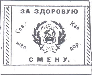 1928(?) г. Разм. 58 х 44 мм. Одноцветная печать на тонкой желтоватой бумаге. В центре в прямоугольной рамке разм. 56 х 33 мм герб РСФСР. По окружности герба текст: «Сев[еро].-Кав[казская]. Жел[езная]. дор[ога].». Текст в две строки: «За здоровую смену».