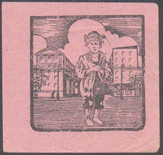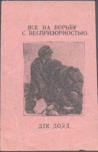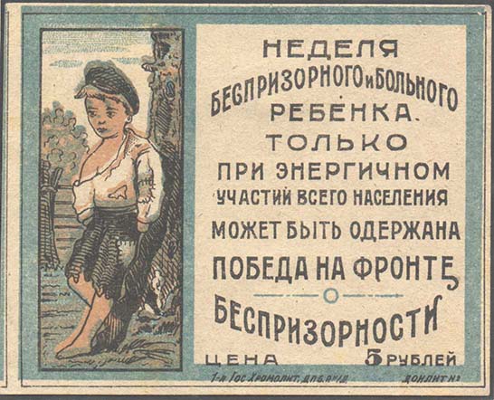 1925(?) г. Разм. 50 х 50 мм. Одноцветная печать на бумаге различных цветов. В центре в прямоугольной рамке разм. 39 х 39 мм с закругленными нижними краями беспризорный ребенок на фоне городских зданий.