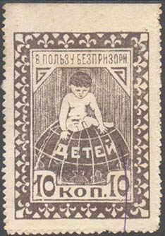 1925(?) г. Разм. рамки 32 х 44 мм. Одноцветная печать на белой (оттенки) бумаге. Зубц. С клеем. В центре в прямоугольной рамке ребенок, сидящий на земном шаре. Текст в две строки: «В пользу беспризорн[ых]. детей».