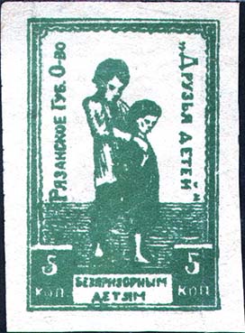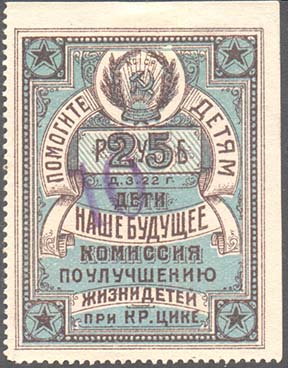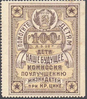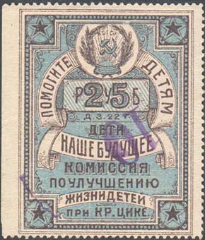 1922 г. Разм. рамки 42,5 х 54,5 мм. Двухцветная печать на белой бумаге. Зубц. 11 1/2. В декоративной рамке по углам в кружках пятиконечные звезды. В центре сверху герб Кр.С.С.Р. На ленте текст: «Помогите детям». Ниже номинал. Ниже текст шесть строк: «Дети наше будущее. Комиссия по улучшению жизни детей при КР.ЦИКЕ».