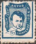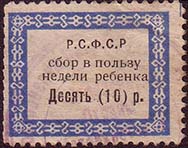 1923 г. Разм. по перфорации 31 х 25 мм. Двухцветная печать на белой бумаге. Зубц. 11 1/2. В центре в прямоугольной рамке разм. 27 х 20 мм текст в три строки: «Р.С.Ф.С.Р. сбор в пользу недели ребенка». Внизу номинал прописью и цифрами.