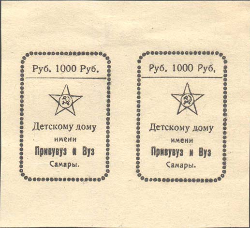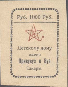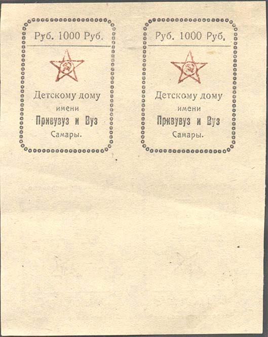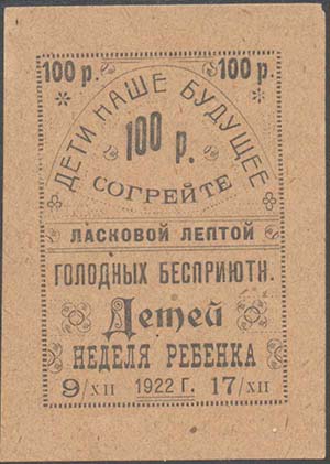 1922 г. Разм. 50 х 70 мм. Одноцветная печать на серо-желтой бумаге. В центре в прямоугольной рамке из черточек текст в четыре строки: «Согрейте ласковой лептой голодных бесприютн[ых]. детей». Внизу текст в две строки: «Неделя ребенка 9/XII 1922 г. 17/XII». Сверху полукругом текст: «Дети наше будущее». Сверху по углам номинал.