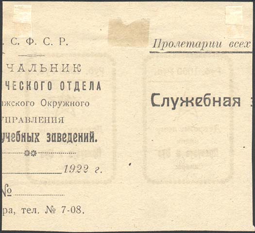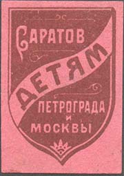 1918(?) г. Разм. рис. 26 х 39 мм. Одноцветная печать на светло-розовой бумаге. В центре в фигурной рамке текст в пять строк: «Саратов детям Петрограда и Москвы».