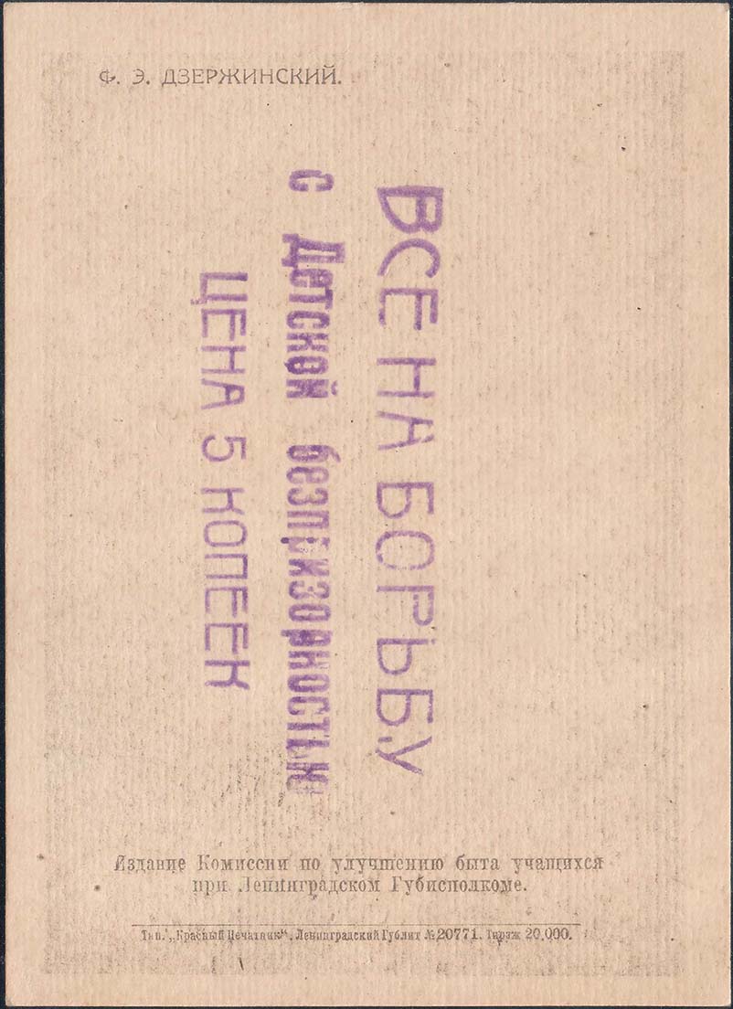 1925(?) г. Листок разм. 100 х 140 мм. Одноцветная двкхсторонняя печать на толстой желтоватой бумаге. На лицевой стороне репродукция фотографии Ф.Э. Дзержинского. На оборотной стороне слева вертикально текст: «Ф.Э.Дзержинский». Справа вертикально текст в две строки: «Издание комиссии по улучшению быта учащихся при Ленинградском Губисполкоме». Справа вертикальная черна и выходные данные мелким шрифтом: «Тип «Красный Печатник». Ленинградский Гублит №20771. Тираж 20.000». На оборотной сторонефиолетовый оттиск ручного штампа с текстом в три строки: «Все на борьбу с детской беспризорностью. Цена 5 копеек».