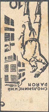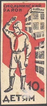 1928 г. Разм. 27 х 61 мм. Двухцветная печать на плотной сероватой бумаге. Пионер на фоне домов. Текст: «Смольнинский район детям 10 к.».