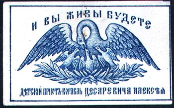 1915(?) г. Разм. рамки 54 х 32 мм. Одноцветная печать на белой бумаге. В центре эмблема ВУИМ - лебедь с птенцами в гнезде. Сверху полукругом текст: «И вы живы будете». Внизу текст: «Детский приют-корабль Цесаревича Алексея».