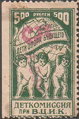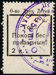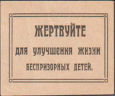 1924(?) г. Разм. рамки 23 х 22 мм. Одноцветная печать на плотной белой бумаге. Нерегулярная зубцовка. В центре в прямоугольной рамке в правом верхнем и в левом нижнем углу номинал. В центре текст в три строки: «Тов[арищ]! Помоги беспризорным!». Сверху текст: «О-во друг детей». На лицевой стороне фиолетовый оттиск круглой печати общества.