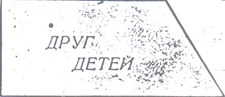 1930(?) г. Виньетка сложной формы в виде прямоугольника со скошенной правой стороной разм. 75 х 33 мм. Одноцветная печать на серо-оранжевой бумаге. В центре текст в две строки: «Друг Детей».