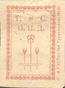 1923 г. Первый выпуск. Разм. 37 х 50 мм. Одноцветная печать на желтоватой бумаге. В двойной декоративной пря-моугольной рамке разм. 26,5 х 40,5 мм сверху аббревиатура в две строки: «Т.С.О.П.Д.». Внизу растительный орнамент. Справа с наружной стороны рамки выходные данные мелким шрифтом: «С.-А.Г. Тип.№4. Туркглавлит №640».