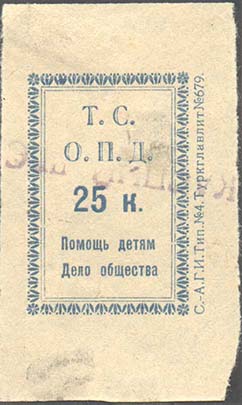 1923 г. Второй выпуск. Разм. 37 х 50 мм. Одноцветная печать на желтоватой бумаге. В двойной декоративной прямоугольной рамке разм. 26,5 х 40,5 мм сверху текст в три строки: «Т.С.О.П.Д.». Внизу текст: «Помощь детям дело общества». Справа с наружной стороны рамки выходные данные мелким шрифтом: «С.-А.Г. Тип.№4. Туркглавлит №640».
