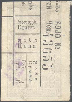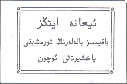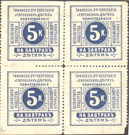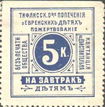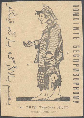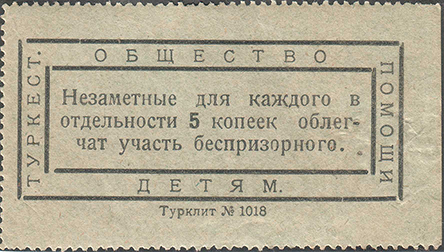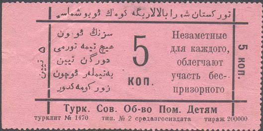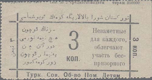 1924(?) г. Разм. рамки 64 х 27 мм. Одноцветная печать на бумаге различных цветов. В рамке номинал текст на русском и узбекском, арабским шрифтом языках: «...коп. Незаметные для каждого, об-легчают участь беспризорного». Внизу под рамкой текст: «Турк[естанское]. Сов[етское]. Об-во Пом[ощи]. Детям». Внизу мелким шрифтом выходные данные.